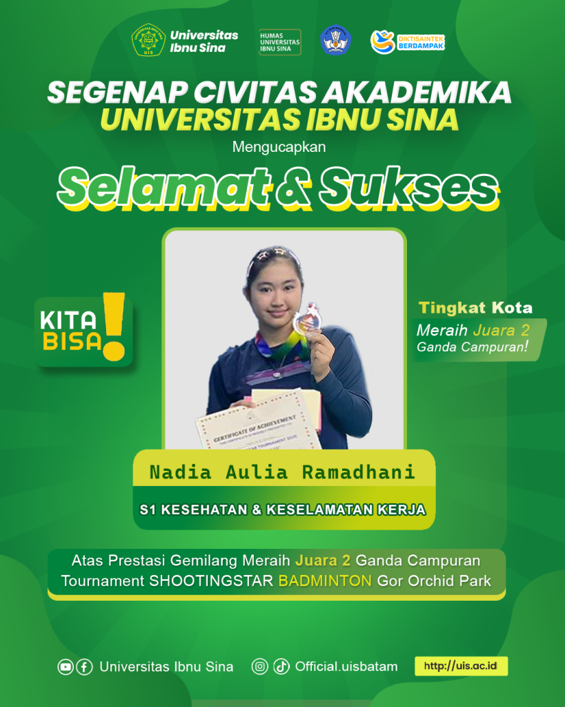UIS — Nadia Aulia Ramadhani, mahasiswi Program Studi S1 Kesehatan dan Keselamatan Kerja (K3), berhasil meraih Juara 2 Ganda Campuran pada Tournament ShootingStar Badminton tingkat kota yang digelar di Gor Orchid Park, Minggu (2/11/2025). Turnamen yang diikuti oleh berbagai klub se-Kota Batam ini menjadi ajang bergengsi bagi para pegiat olahraga bulu tangkis. Nadia tampil gemilang […]