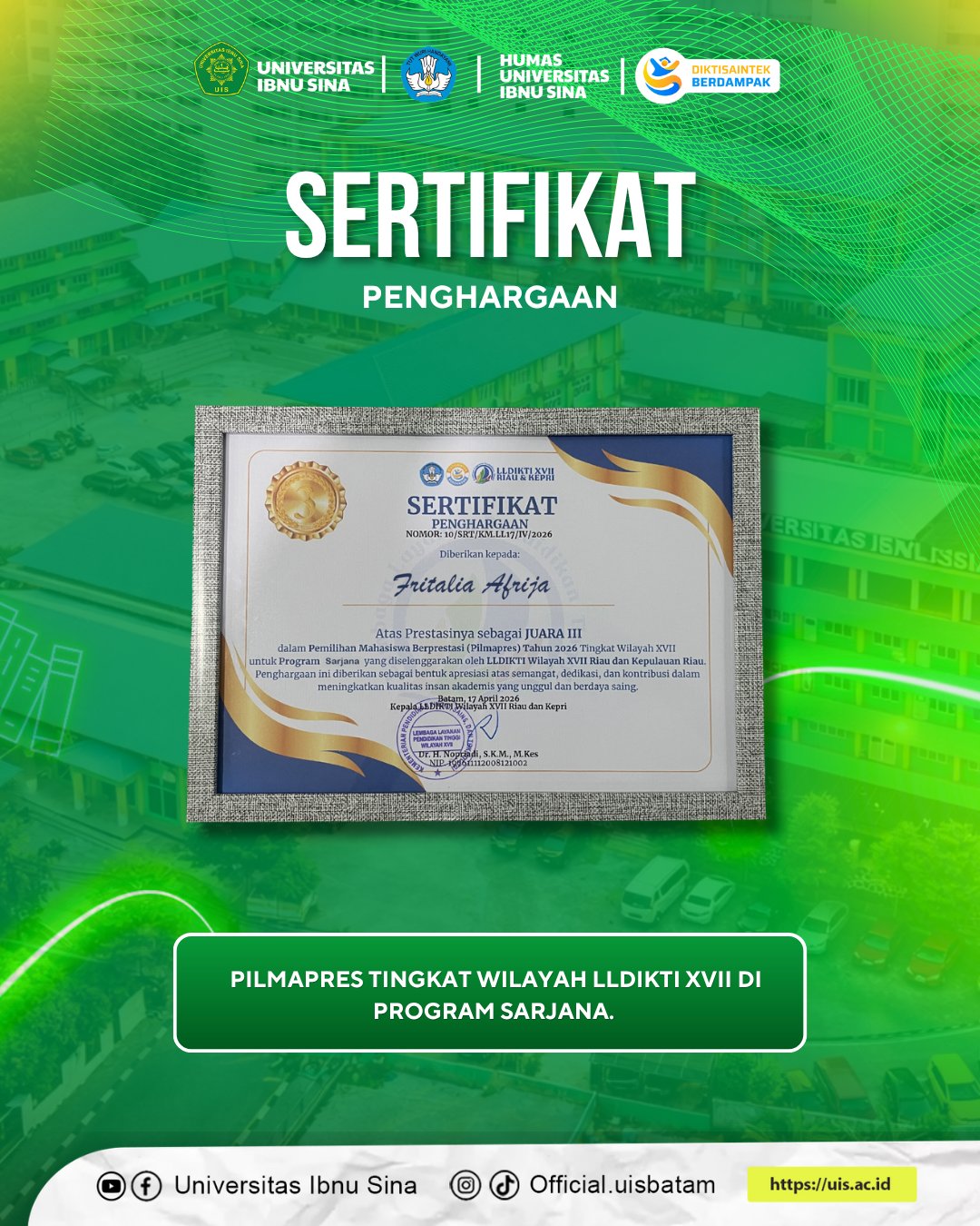 Keberhasilan ini menjadi bukti komitmen Universitas Ibnu Sina dalam mencetak generasi profesional muda yang unggul dan berdaya saing. Prestasi yang diraih Fritalia Afrija diharapkan dapat menjadi inspirasi bagi mahasiswa lainnya untuk terus berkarya dan memberikan kontribusi nyata bagi masyarakat.