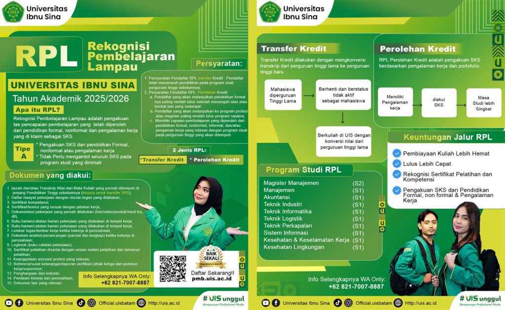 UIS – Universitas Ibnu Sina menyediakan layanan pendidikan yang inklusif dengan menerima mahasiswa baru melalui Program RPL (Rekognisi Pembelajaran Lampau). Program ini dirancang untuk memberikan kemudahan bagi calon mahasiswa yang memiliki pengalaman dan kompetensi melalui proses transfer kredit SKS serta perolehan kredit SKS dari pembelajaran lampau.