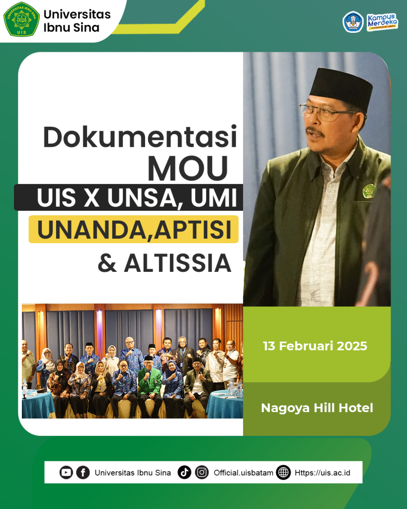 UIS – Universitas Ibnu Sina (UIS) menandatangani Nota Kesepahaman (MoU) dengan Universitas Surakarta (UNSA), Universitas Muslim Indonesia (UMI), Universitas Andi Djemma (UNANDA), Asosiasi Perguruan Tinggi Swasta Indonesia (APTISI), dan Lembaga Bahasa ALTISSIA. Acara ini berlangsung di sela-sela Rembuk Nasional, Rapat Pengurus Pusat, dan Pleno ke-IV APTISI pada Sabtu (15/2/2025) di Nagoya Hill Hotel, Batam.