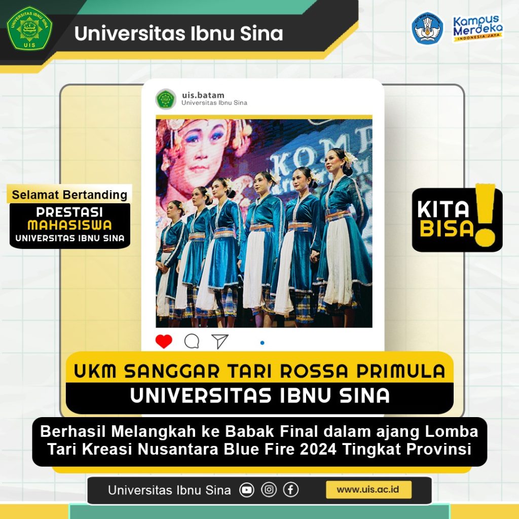 UIS – Unit Kegiatan Mahasiswa (UKM) Sanggar Tari Rossa Primula dari Universitas Ibnu Sina melangkah ke babak final dalam ajang Tari Kreasi Nusantara Blue Fire 2024 tingkat Provinsi Kepulauan Riau. Keberhasilan ini merupakan hasil dari dedikasi, latihan intensif, dan kreativitas tim dalam menyuguhkan tari kreasi yang menggabungkan nilai budaya dan inovasi.